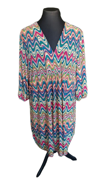 Wat een leuke zomerjurken, gemaakt van travelstof. We hebben diverse printen. Met een leuke V-hals en bij de mouw zit elastiek zodat je een pofmouw effect krijgt.
