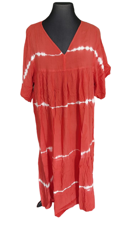Een mooie lange zomerjurk met een V-hals. Zit geen mouw in vandaar dat deze met een grotere maat gedragen kan woden.