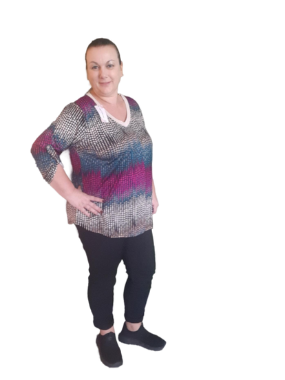 Een leuk shirt met ophaallusjes bij de mouwen. Deze heeft een V-hals met een goud lurex draadje. Diverse printen.